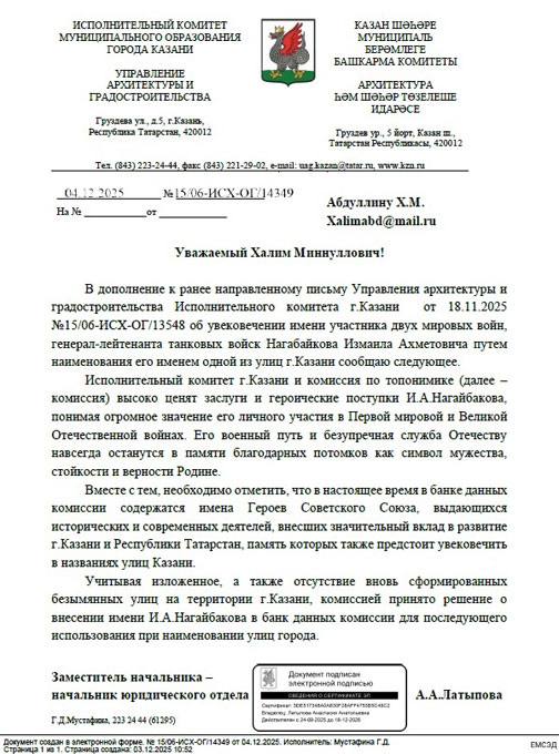 По инициативе заведующего отделом новой истории, к.и.н. Халима Абдуллина имя татарского офицера периода двух мировых войн, генерал-лейтенанта танковых войск Нагабайкова Измаила Ахметовича (1896‒1959) внесено в банк данных Комиссии по топонимике Казани для последующего использования при наименовании одной из улиц города.
